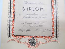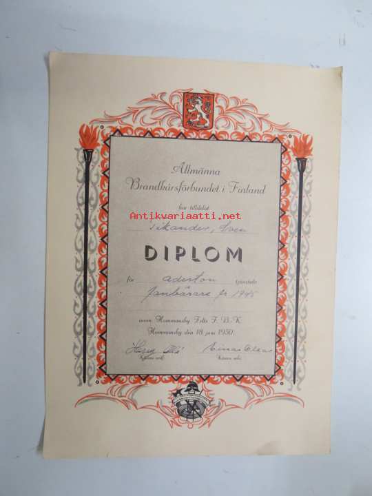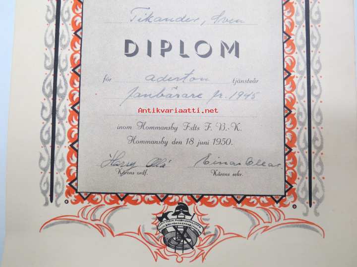 Allmänna Brandkårsförbundet i Finland har tilldelat Sven Tikander Diplom för åderton tjänsteår för fanbärare fr. 1945 inom Hommnasby... FBK -certificate