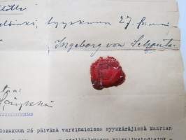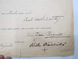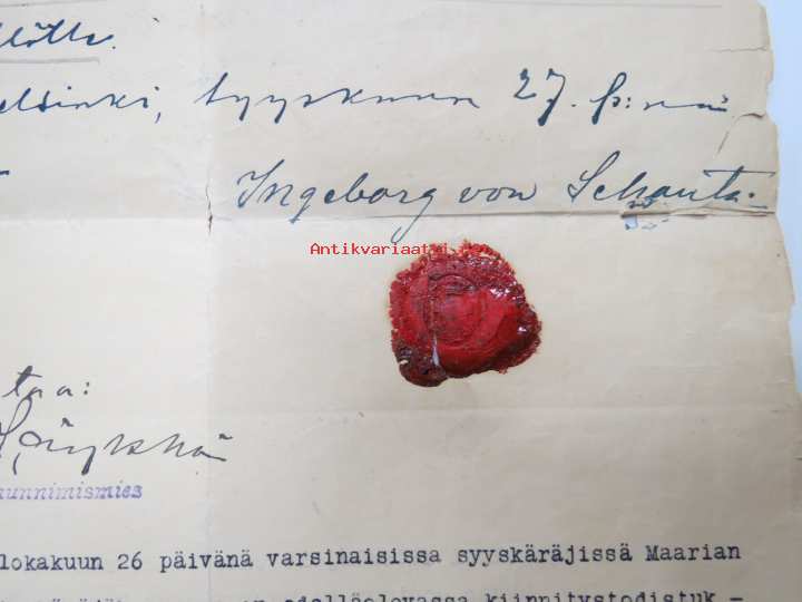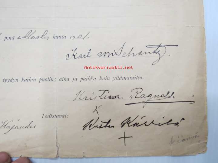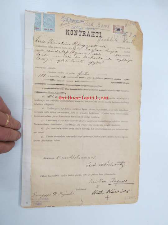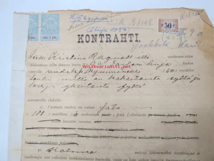 Kontrahti - Leski Kristina Ragnell´ille Toinen Linja 9a (Maaria - Raunistula) 50 vuodeksi tontin 11 x 12 syltä, 11.3.1901 Karl von Schantz & Ingeborg von Schantz...