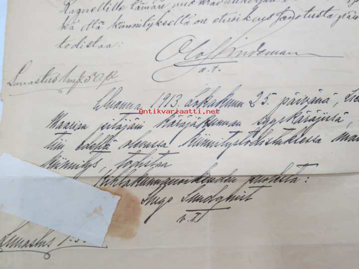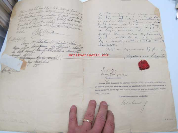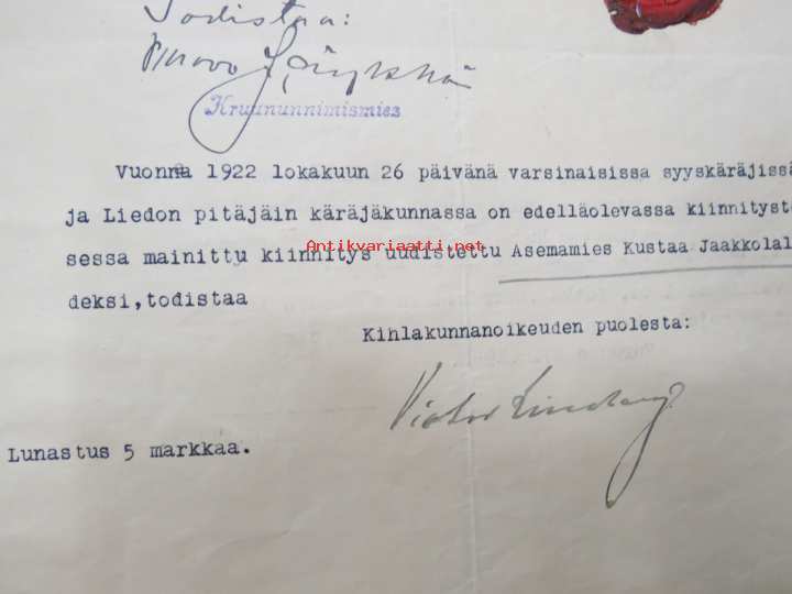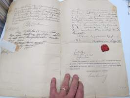 22 x 35 cm. Tontinvuokra- ja kiinnityssopimus erilaisinen virallisine teksteineen ja käänteineen.