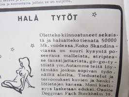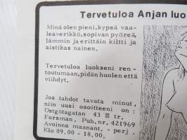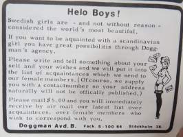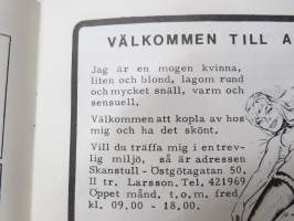 15 x 21 cm. Ilmeisesti 1960-luvun loppupuolen opaskirjanen Tukholman iloihin, julkaisijana "Doggman".