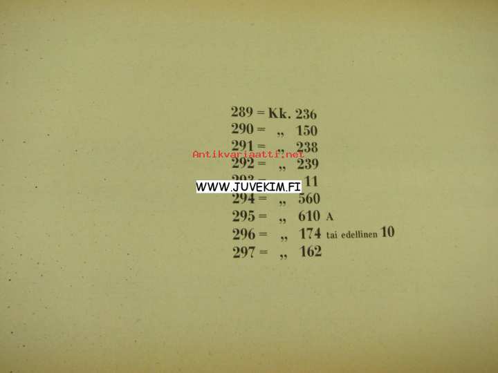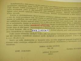 | Saatavilla | 1 kpl | | Julkaisuvuosi | 1940 | | Sivuja | 168 | | Painos | 1. | | Kunto | K2 | | Sidonta/painoasu | Sidottu (kovak.) | | Kielet | Suomi |