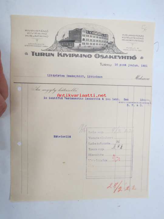 Turun Kivipaino Oy, Turku 16.12.1921 -asiakirja / business document