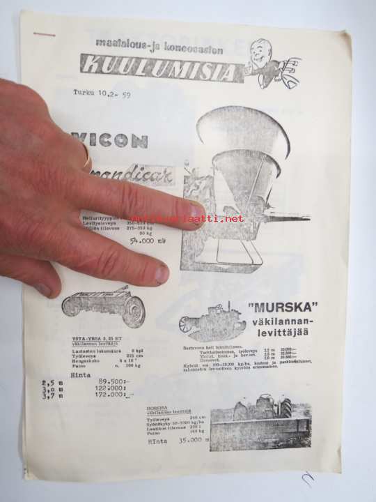 Kesko maatalous- ja koneosaston kuulumisia 10.2.1959; Vicon Spandicar, Ysta-Yrsa + Murska + Horsma väkilannanlevittäjät, Sampo & Kronos äkeet -esite