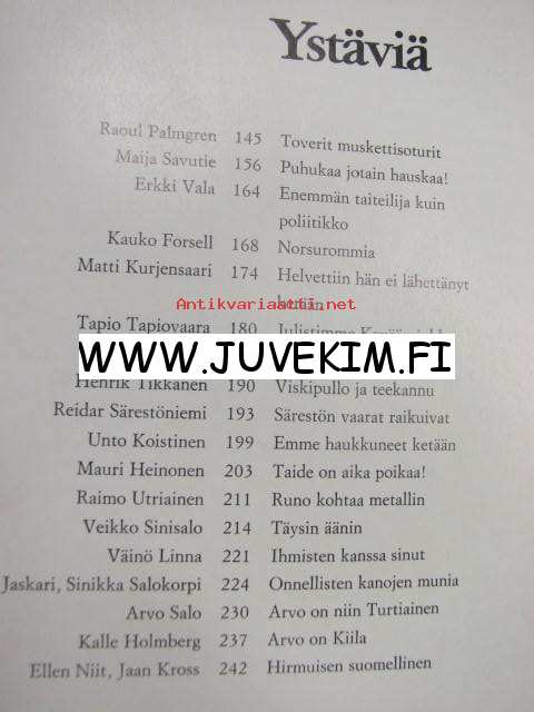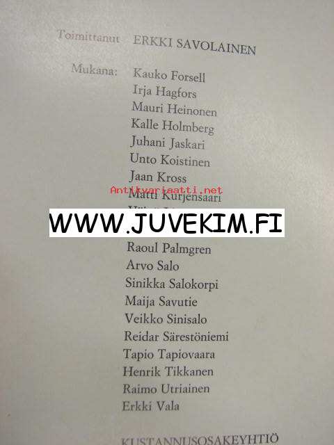 | Saatavilla | 1 kpl | | Julkaisuvuosi | 1980 | | Sivuja | 245 | | Painos | 1. | | Kunto | K3 | | Sidonta/painoasu | Sidottu (kovak.) | | ISBN | 951-30-5174-9 | | Kielet | Suomi |