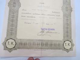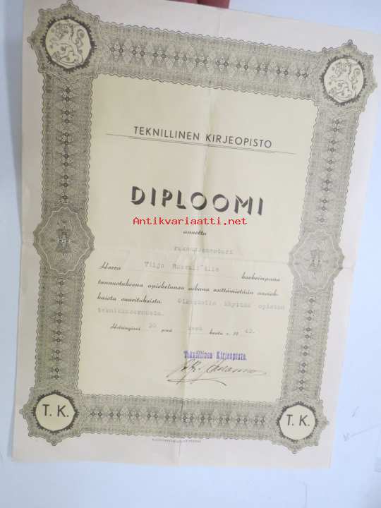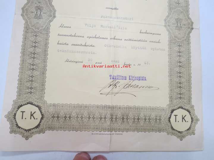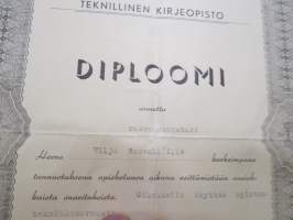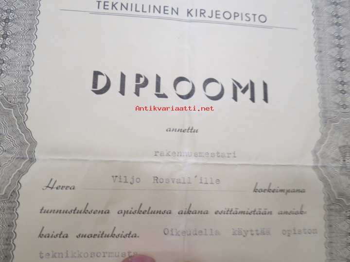 Diploomi - Teknillinen kirjeopisto, rakennusmestari Viljo Rosvall ...oikeudella käyttää teknikkosormusta, 30.6.1943 -certificate, technical studies