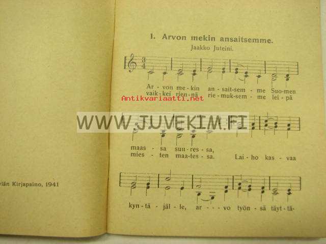 | Saatavilla | 1 kpl | | Julkaisuvuosi | 1941 | | Sivuja | 64 | | Painos | 1. | | Kunto | K3 | | Sidonta/painoasu | Nidottu (pehmeäk.) | | Kielet | Suomi |