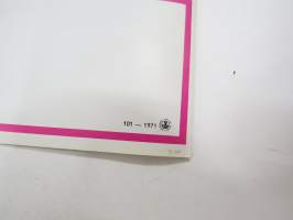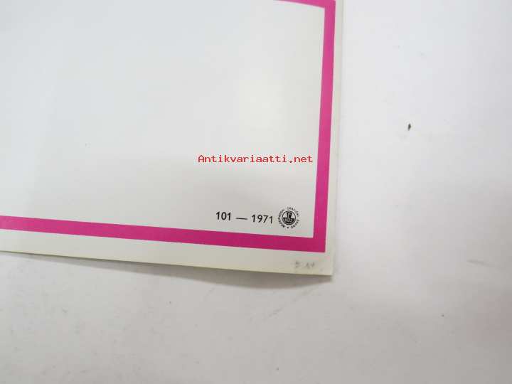 | Saatavilla | 1 kpl | | Julkaisuvuosi | 1971 | | Sivuja | 4 | | Kunto | K3 | | Sidonta/painoasu | Pienpainate | | Kielet | Englanti |