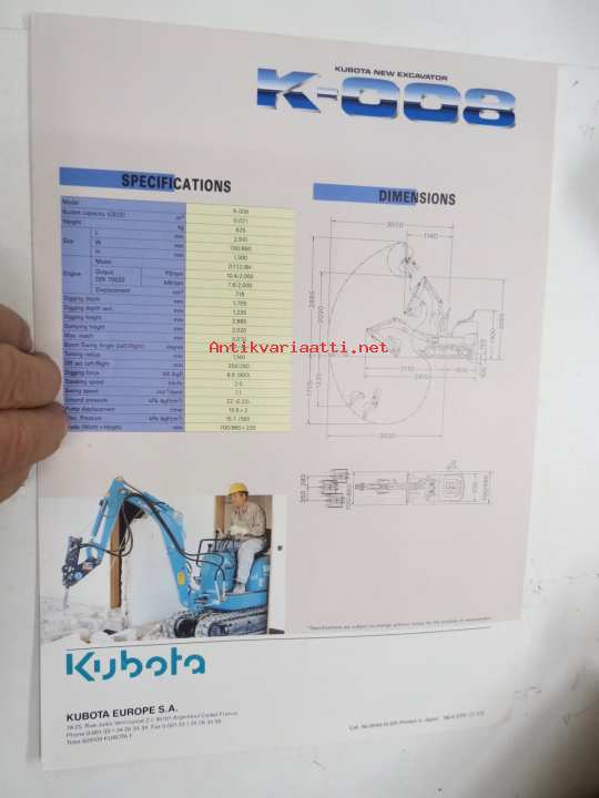 Kubota K-008 kaivinkone -myyntiesite / excavator sales brochure