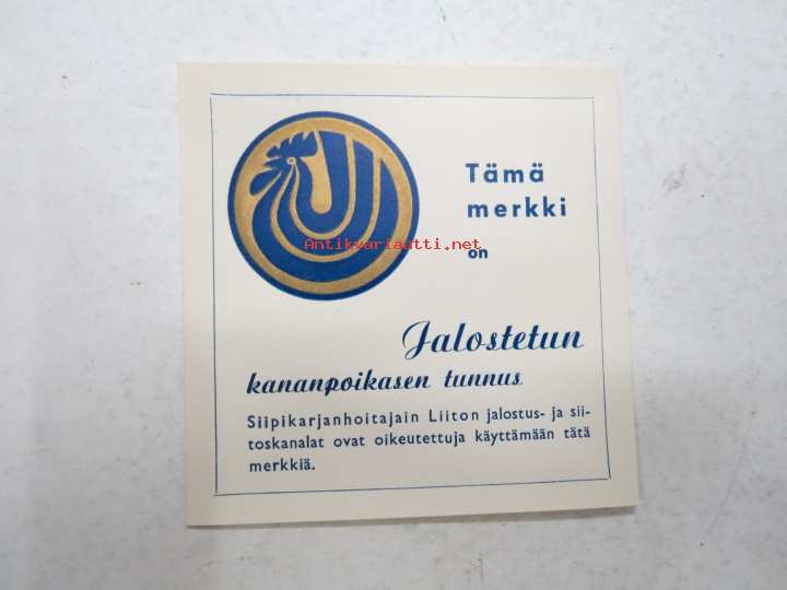 "Jalostetun kananpojan tunnus" -paperietiketti, liimapohja, kuljetuslaatikkoon tarkoitettu etiketti