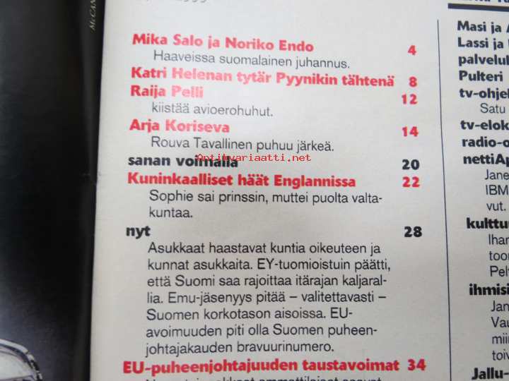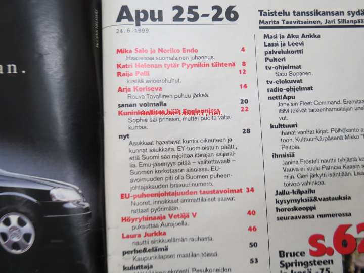 Apu 1999 nr 25-26, 24.6.1999, Mika Salo & Baja, Raija Pelli, Arja Koriseva, Edward & Sophie kuninkaalliset häät, Vetäjä V Aurajoen rannalla, Laura Jurkka, Bruce, ym.