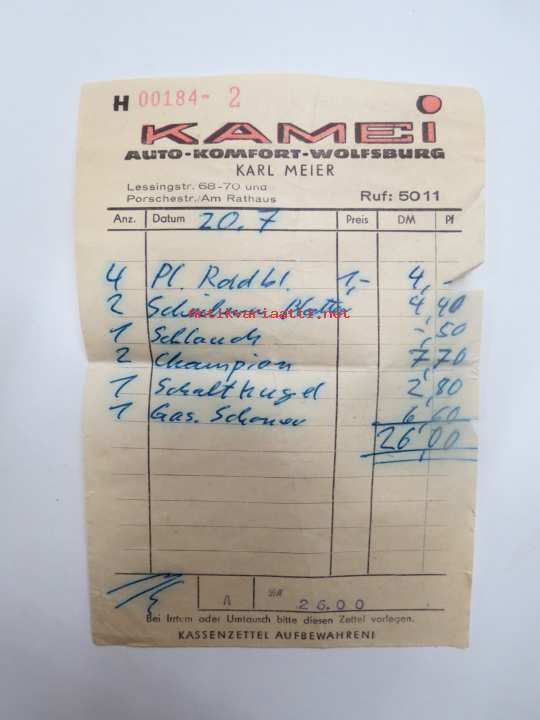 Kamei Auto-Komfort-Wolfsburg - Karl Meier, Lessingstrasse 68-70 und Porschestrasse / Am Rathaus -Volkswagen-kotikaupungin tarvikeliike, kuitti nr H 00184-2, v. 1964