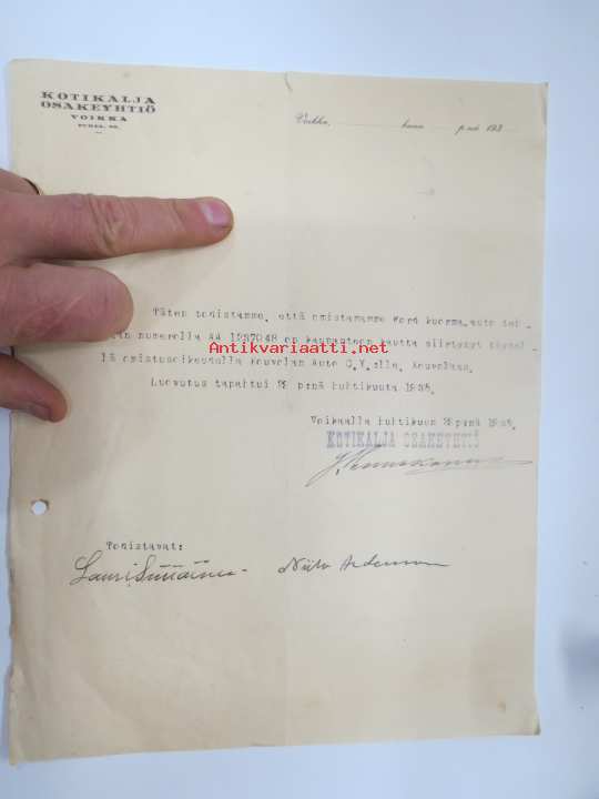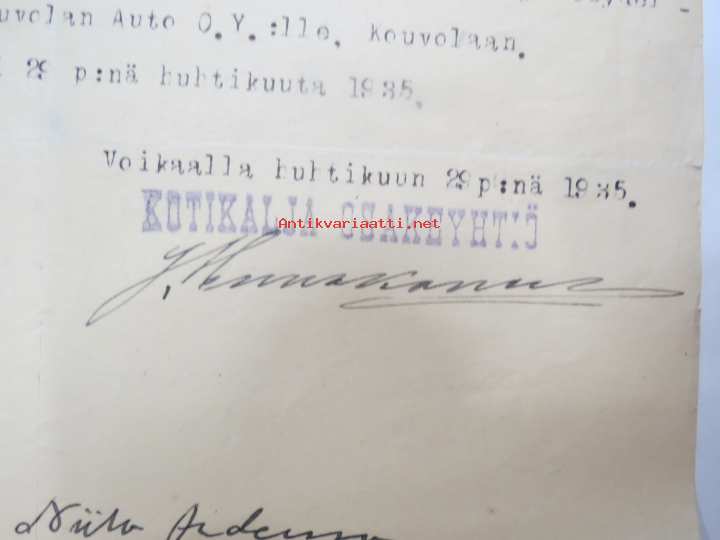 Kotikalja Oy, Voikka (Voikkaa), 29.4.1935, Ford kuorma-auto tehtaan numerolla AA 1237048 myyty Kouvolan Auto Oy:lle -asiakirja / kauppakirja