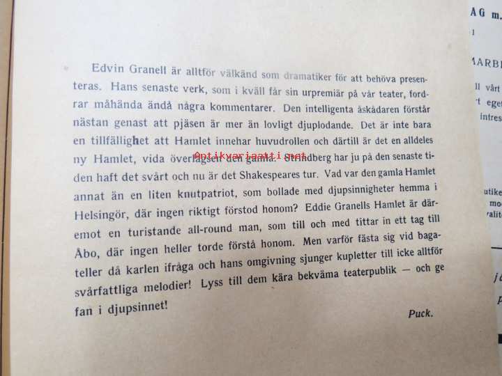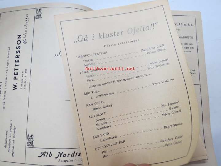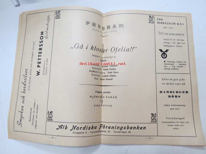 Åbo Svenska Teater spelåret 1951-1952, "Gå i kloster, Ofelia", Program -käsiohjelma / theatre program