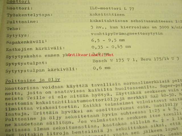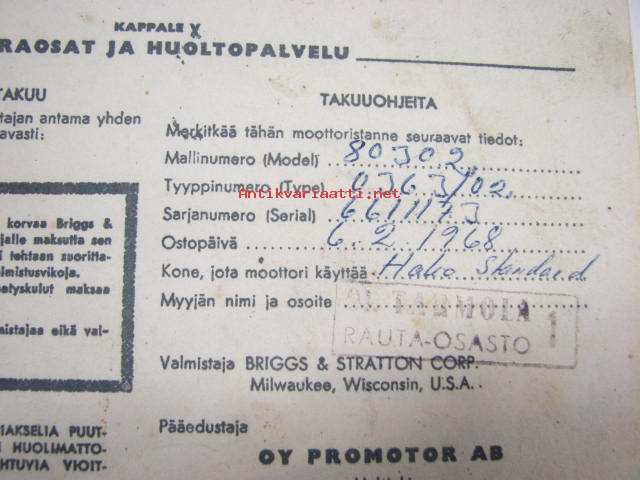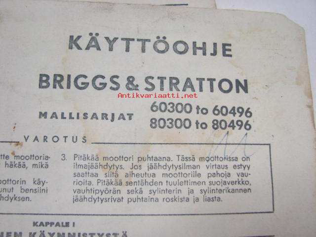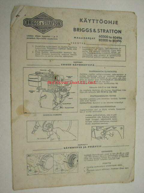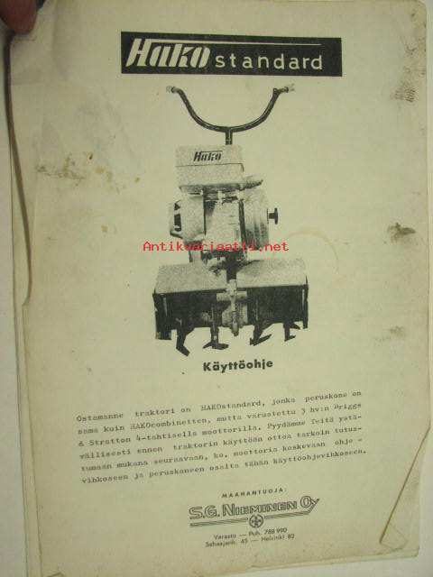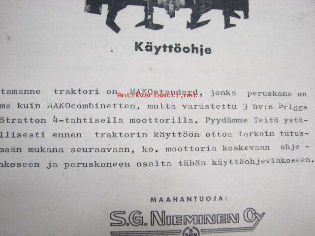 S.G. Nieminen Oy, 1921 x 30 cm nippu. Mukana erilliset ohjeet Briggs & Stratton moottorille.