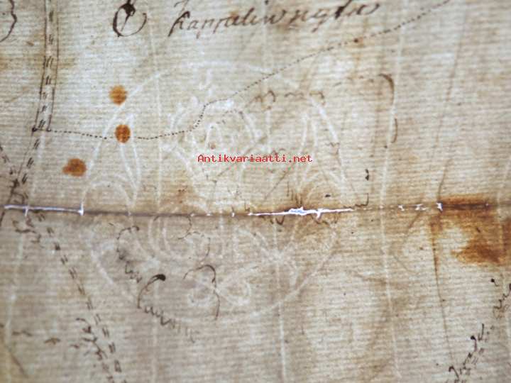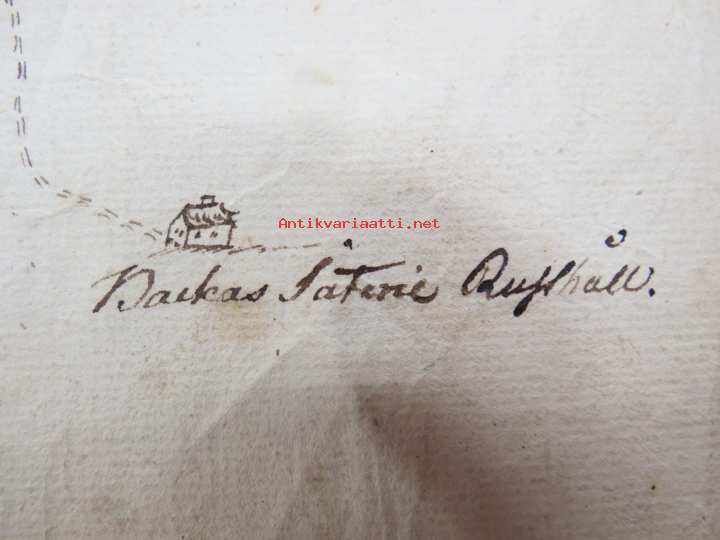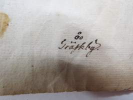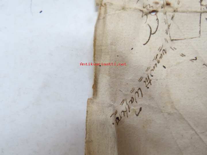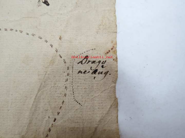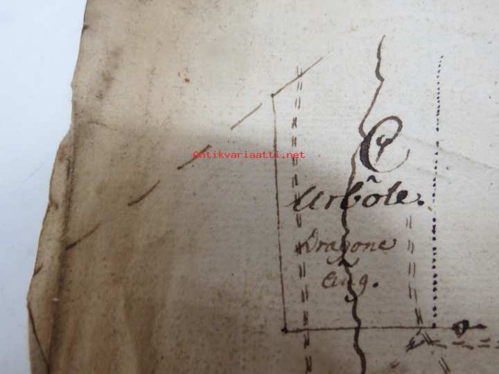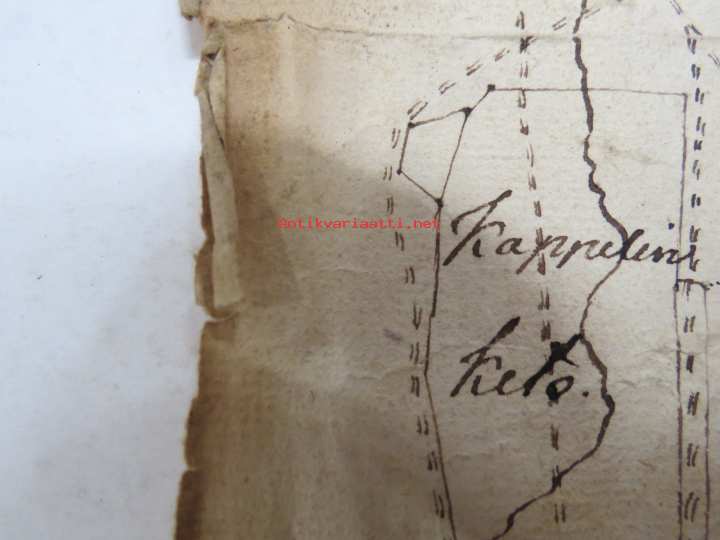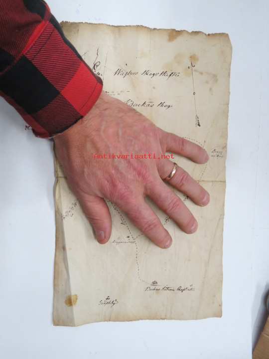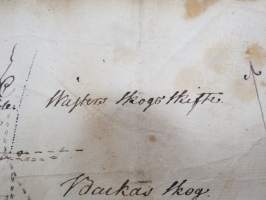 19 x 32 cm. ...Den Gamle vägen, ym. Liittynee maankäyttöön ja kulkuoikeuksiin - joka tapauksessa erittäin harvinainen kartta koskien Sauvon historiaa, tämä myytävänä. Erkoinen vesileimapaperi "GR".