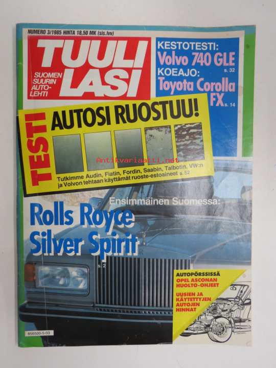 Tuulilasi 1985 nr 3, Rolls-Royce silver Spirit, Corolla FX, Lentäen autolomalle, Hyppy ohittajan alle, Volvo 740 GLE kestotesti, VII Pariisi-Dakar, Ruostesuojatesti