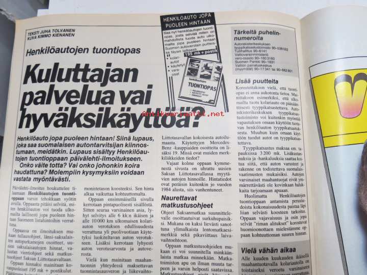| Saatavilla | 1 kpl | | Julkaisuvuosi | 1985 | | Sivuja | 104 | | Kunto | K2 | | Sidonta/painoasu | Lehti | | Kielet | Suomi |