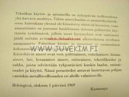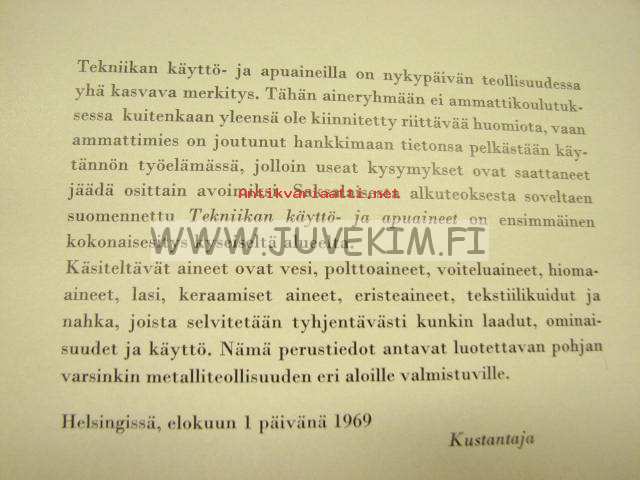 | Saatavilla | 1 kpl | | Julkaisuvuosi | 1969 | | Sivuja | 194 | | Painos | 1. | | Kunto | K3 | | Sidonta/painoasu | Kuvitettu kovakantinen | | Kielet | Suomi |