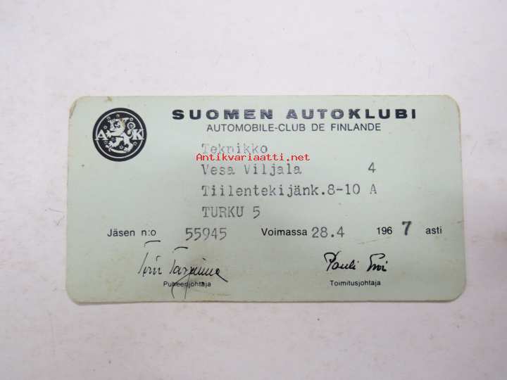 Suomen Autoklubi - Automobile-Club De Finlande, jäsen nr 55945, 1967 -jäsenkortti