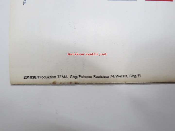 | Saatavilla | 2 kpl | | Julkaisuvuosi | 1974 | | Sivuja | 16 | | Kunto | K2 | | Niitit ruosteessa | | Sidonta/painoasu | Nidottu (pehmeäk.) | | Kielet | Suomi |