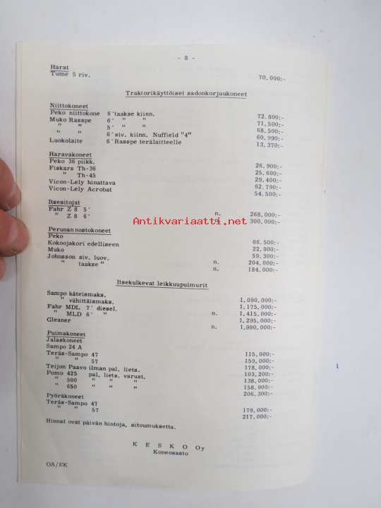 Kesko Oy Maatalouskonehinnasto 15.3.1959