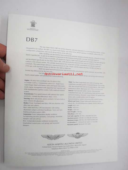 Aston Martin DB 7 -myyntiesite / sales brochure