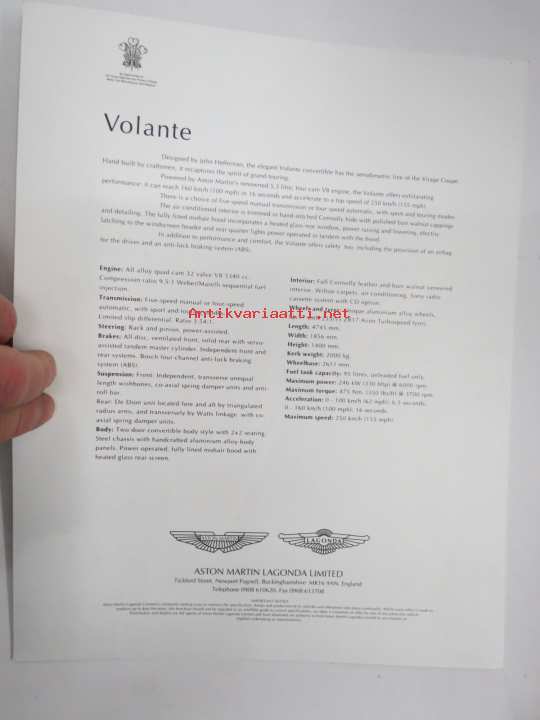 Aston Volante -myyntiesite / sales brochure