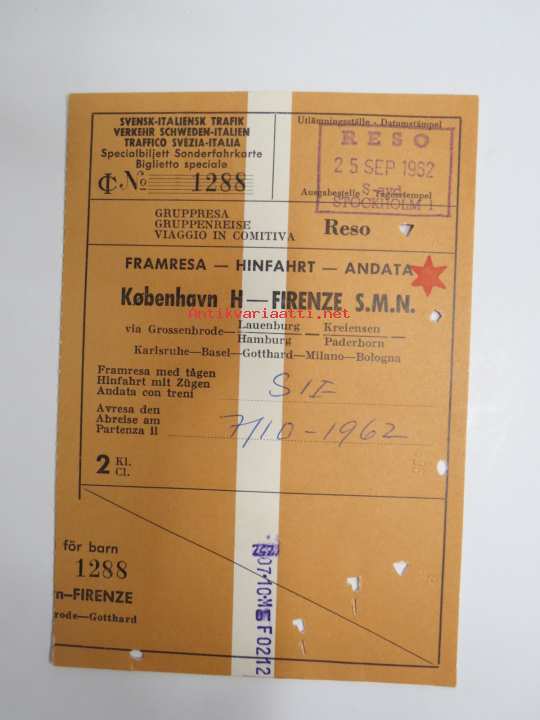 Firenze S.M.N. - Köpenhavn H 1962 -rautatielippu / railway tickets