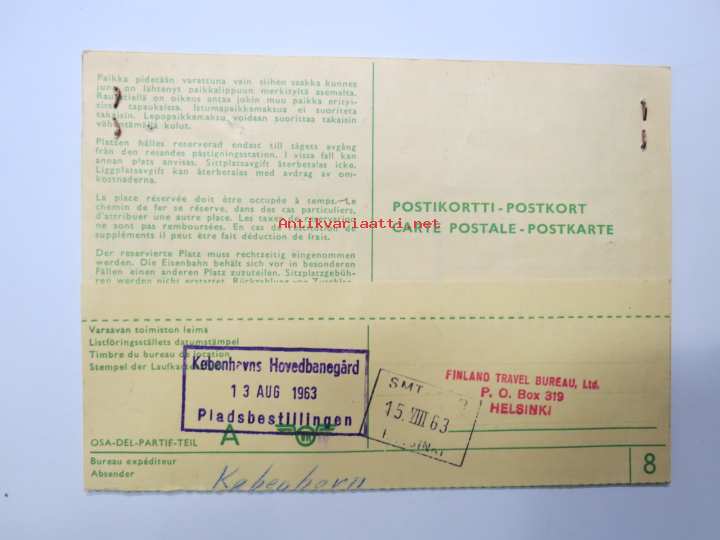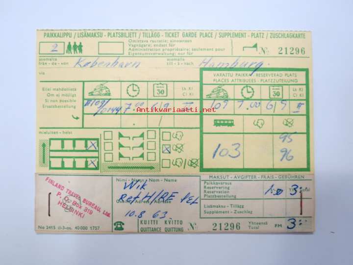 Köpenhavn Hamburg paikkalippu 10.8.1963 -rautatielippu / railway ticket