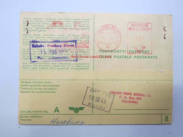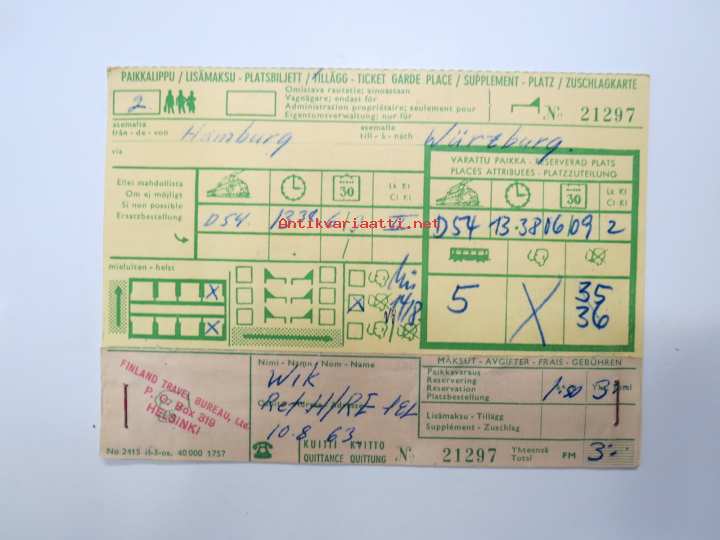 Hamburg - Würzburg paikkalippu 10.8.1963 -rautatielippu / railway ticket