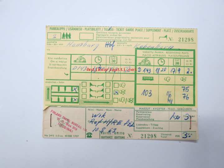Hamburg Hbf - Köbenhavn paikkalippu 10.8.1963 -rautatielippu / railway ticket
