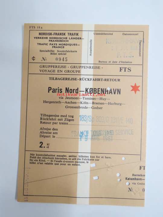 Paris Nord - Köbenhavn - Nordisk-Fransk trafik, 19.8.1961 -rautatielippu / railway ticket