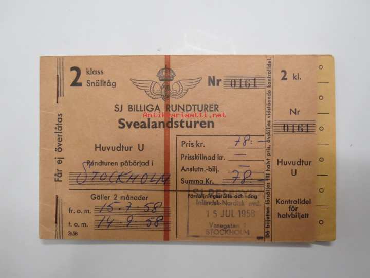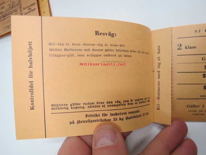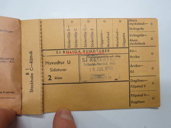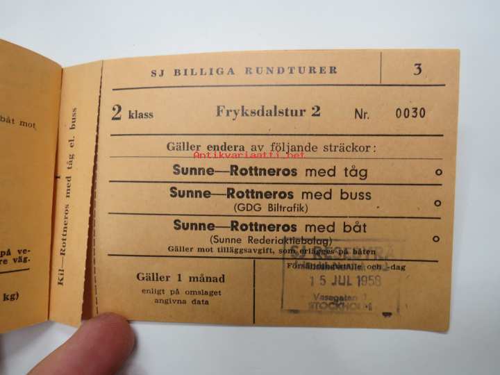 SJ Statens Järnvägar - Billiga rundturer - Kil-Sunneturen (Frykdalstur 2) nr 0030 2 kl. 15-7.1958 - 14.8.1958 -biljetthäfte / matkalippuvihko / train ticket