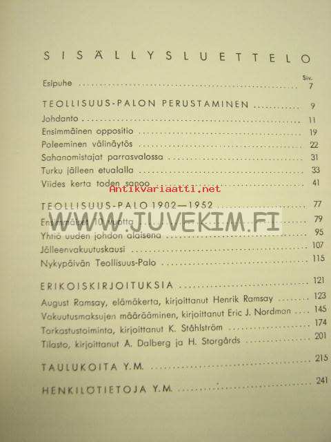 | Saatavilla | 3 kpl | | Julkaisuvuosi | 1952 | | Sivuja | 254 | | Painos | 1. | | Kunto | K3 | | Sidonta/painoasu | Nahkaselkä | | Kielet | Suomi |