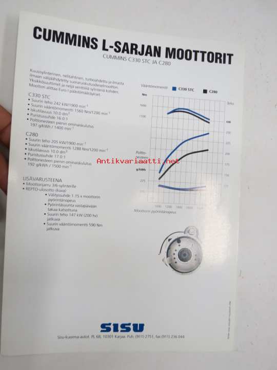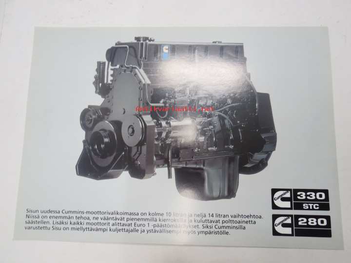 Sisu Cummins 330 STC, 280 moottori -myyntiesite, sales brochure, in finnish