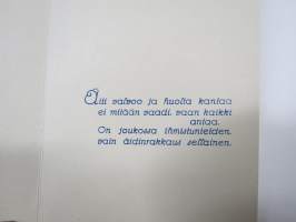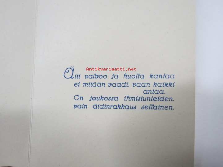Äidille - Äitienpäivä - Äitienpäiväkortti 1940-luvulta; Äiti valvoo ja huolta kantaa ei mitään vaadi, vaan kaikki antaa. On joukossa ihmistunteiden vain äidinrakkaus