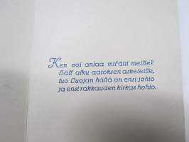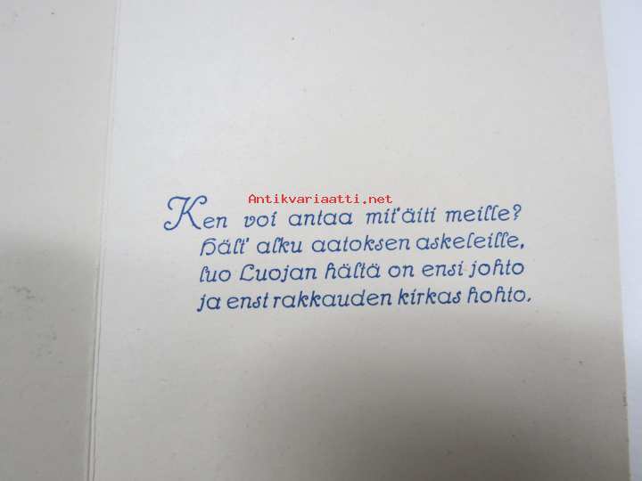 Äidille - Äitienpäivä - Äitienpäiväkortti 1940-luvulta; Ken voi antaa mit´äiti meille? Häll´alku aatoksen askeleille, luo Luojan hältä on ensi johto ja ensi...