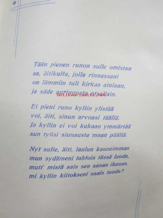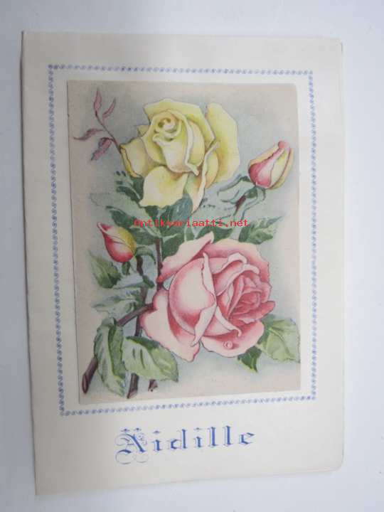 Äidille - Äitienpäivä - Äitienpäiväkortti 1940-luvulta; Tään pienen runon sulle omistan sa, äitikulta, jolla rinnassani on lämmön tuli kirkas ainiaan...