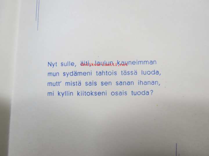 Äidille - Äitienpäivä - Äitienpäiväkortti 1940-luvulta; Nyt sulle, äiti, laulun kauneimman mun sydämeni tahtois tässä luoda, mutt´mistä sais sen sanan ihanan...