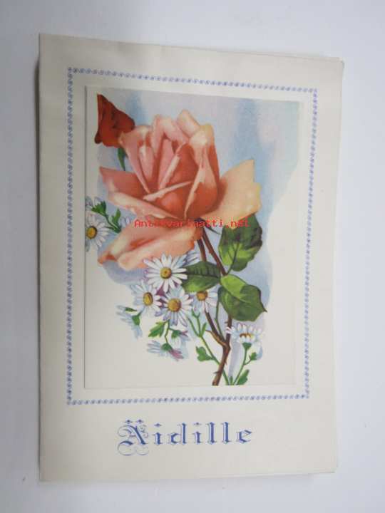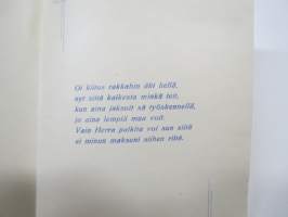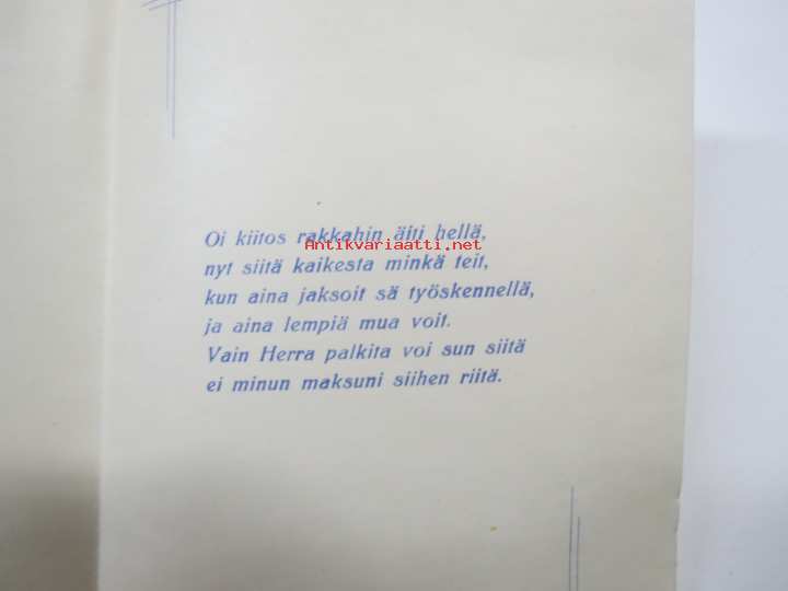 Äidille - Äitienpäivä - Äitienpäiväkortti 1940-luvulta; Oi kiitos rakkahin äiti hellä, nyt siitä kaikesta minkä teit, kun aina jaksoit sä työskennellä, ja aina...