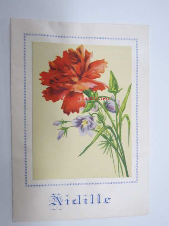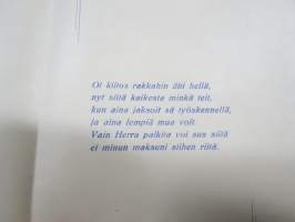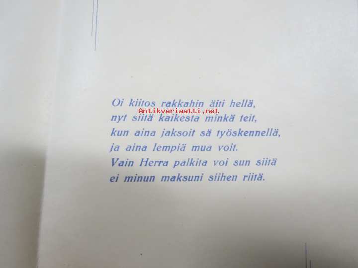 Äidille - Äitienpäivä - Äitienpäiväkortti 1940-luvulta; Oi kiitos rakkahin äiti hellä, nyt siitä kaikesta minkä teit, kun aina jaksoit sä työskennellä, ja aina...