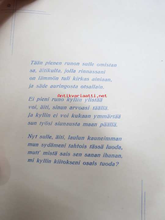 Äidille - Äitienpäivä - Äitienpäiväkortti 1940-luvulta; Tään pienen runon sulle omistan sa, äitikulta, jolla rinnassani on lämmön tuli kirkas ainiaan...