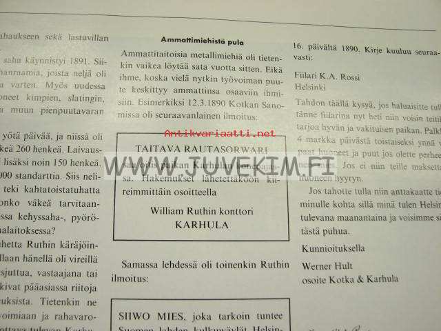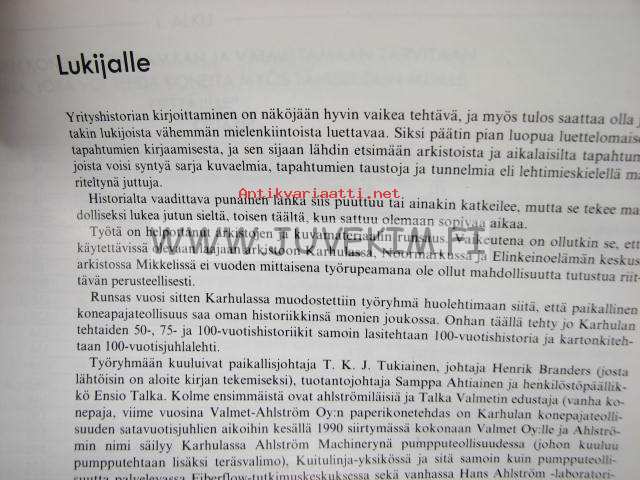 | Saatavilla | 1 kpl | | Julkaisuvuosi | 1990 | | Sivuja | 257 | | Painos | 1. | | Kunto | K4 | | Sidonta/painoasu | Sidottu (kansipaperit) | | ISBN | 952-90-1843-6 | | Kielet | Suomi |