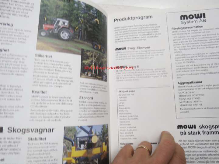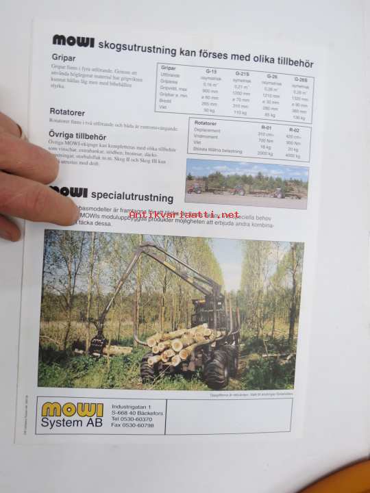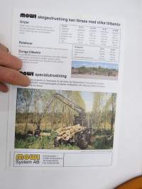 Mowi Skogsutrustning -myyntiesite, ruotsinkielinen / tractor-mounted forestry equipment sales brochure, in swedish