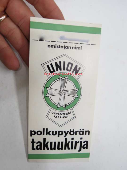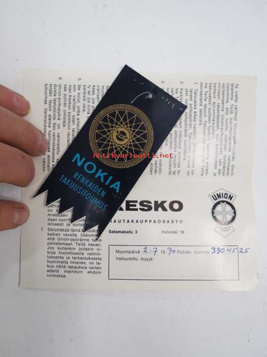 Union polkupyörä, Kesko Oy, 2.7.1970 -takuukortti + Nokia Oy rengastakuu