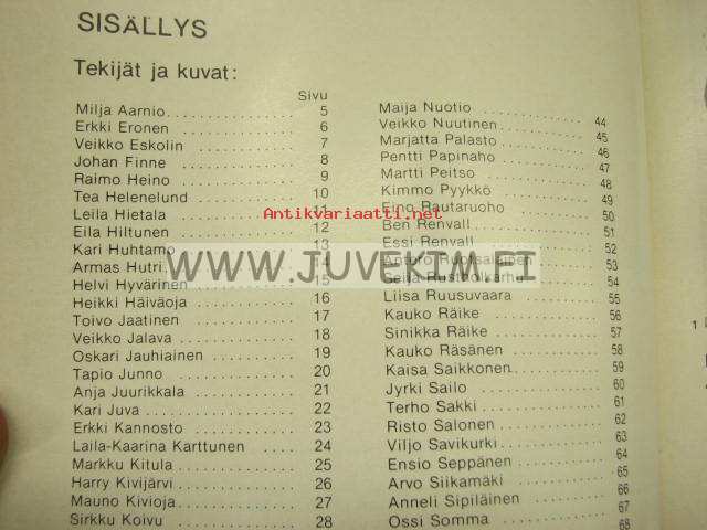 | Saatavilla | 1 kpl | | Julkaisuvuosi | 1974 | | Sivuja | 98 | | Painos | 1. | | Kunto | K3 | | Sidonta/painoasu | Nidottu (pehmeäk.) | | Kielet | Suomi |