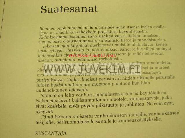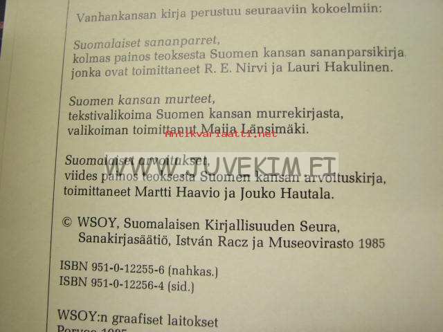 | Saatavilla | 1 kpl | | Julkaisuvuosi | 1985 | | Sivuja | 864 | | Painos | 1. | | Kunto | K3 | | Sidonta/painoasu | Nahkaselkä | | ISBN | 951-0-12255-6 | | Kielet | Suomi |