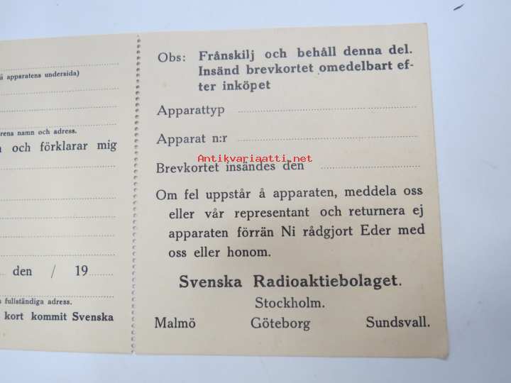 Radiola-mottagare - radio - Garantikort -takuukortti
