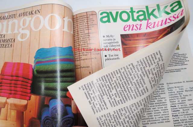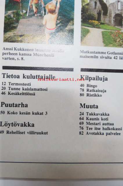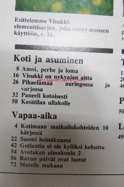 Avotakka 1972 nr 7, Anssi Kukkonen lomailee, Termosastiat testissä, Visukki-aitta, Kaislamatot, Pihaelämä, Paneeli kotoisasti, ym.