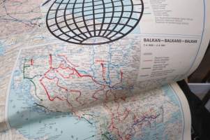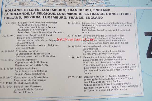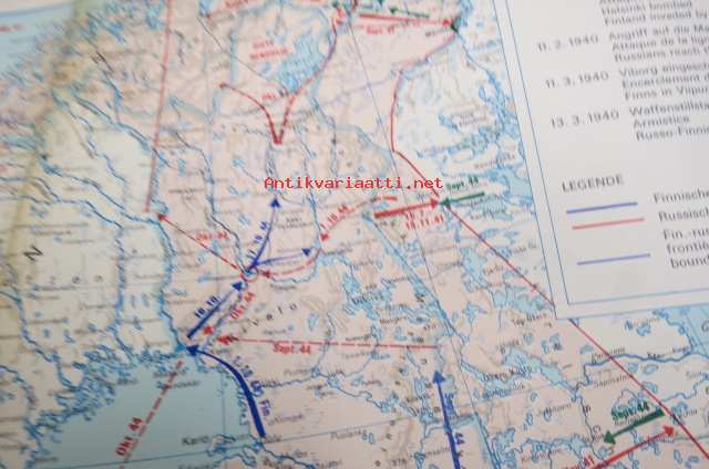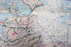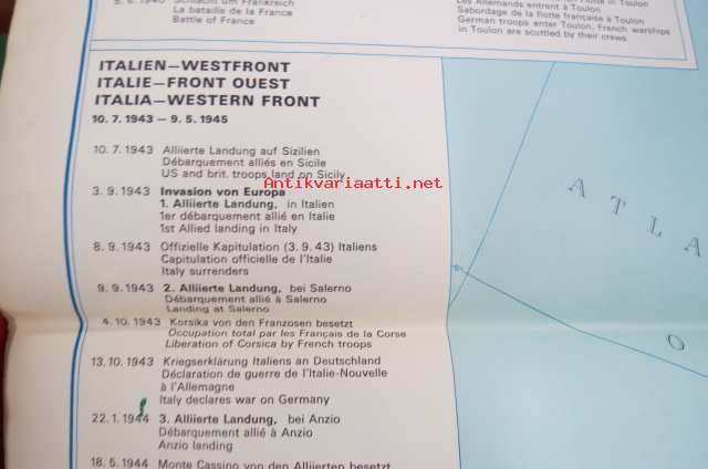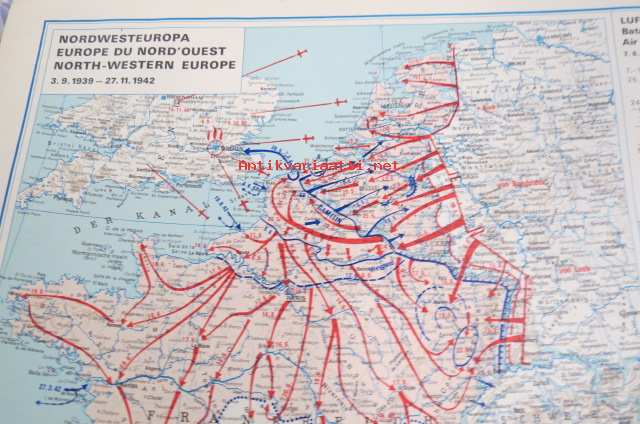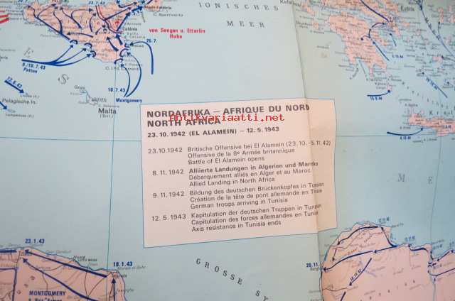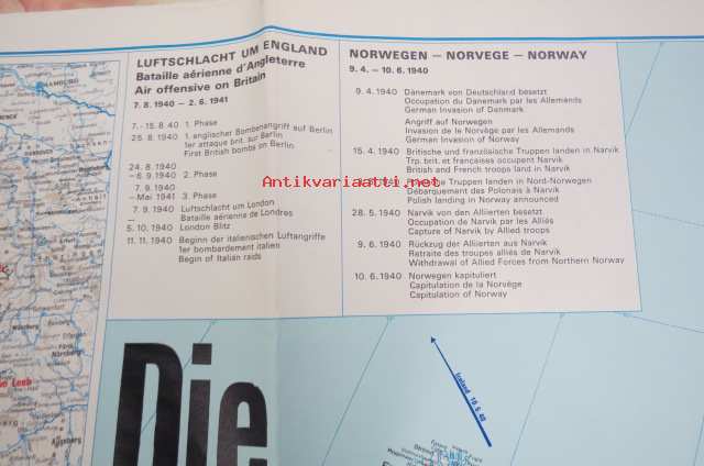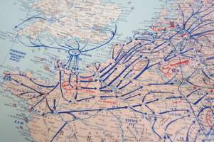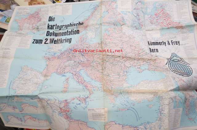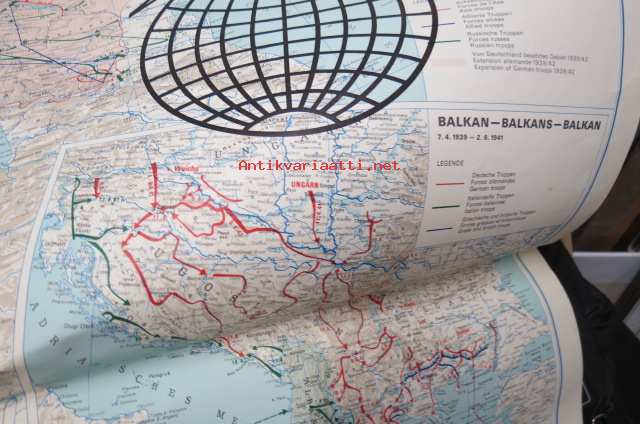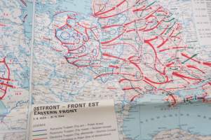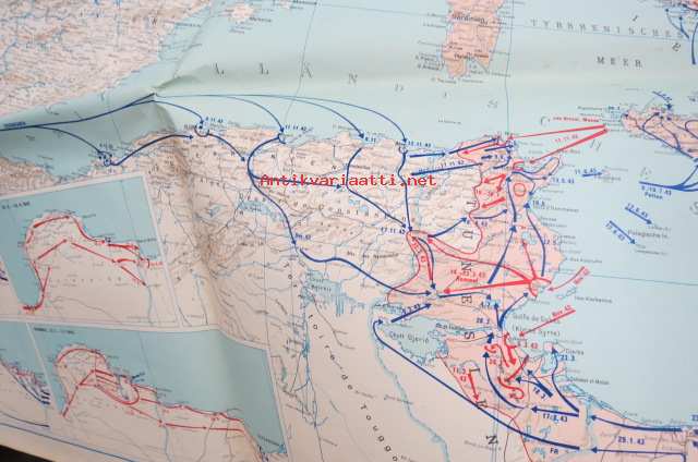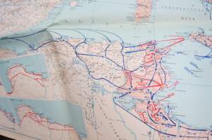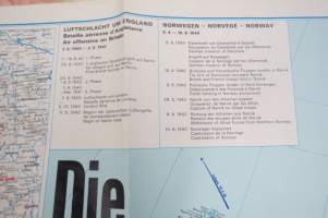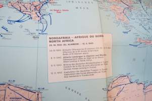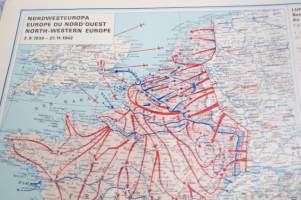 Die kartographische Dokumentation zum 2. Weltkrieg -isokokoiseen seinäkarttaan koottuna II Maailmansodan offensiivit, taistelut, ym. -erinonomainen havainnollistaja